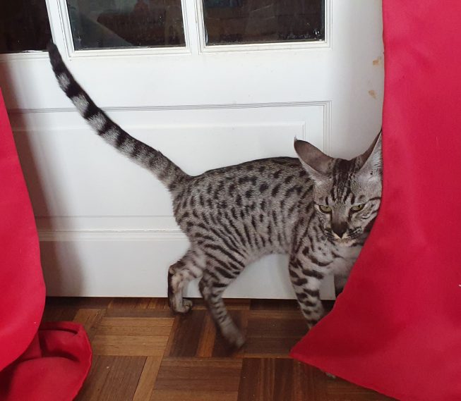 Sous sa robe tachetée d’un éclat sauvage se cache une reine en devenir : fière, curieuse et un brin diva quand il s’agit d’attirer l’attention. Chaque pas est calculé, chaque regard, royal — et gare à celui qui oserait troubler sa majesté pendant sa ronde d’inspection du territoire (aussi connu sous le nom de salon).